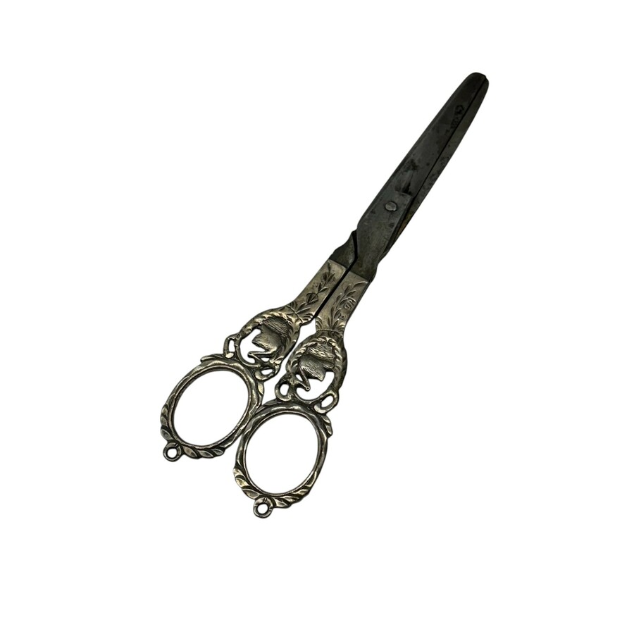Een antieke 18e of vroeg 19e eeuwse zilveren naaischaar, met twee medaillons met voorstelling van zwanen. Gemerkt met jaarletter en meesterteken 'JP' (?).