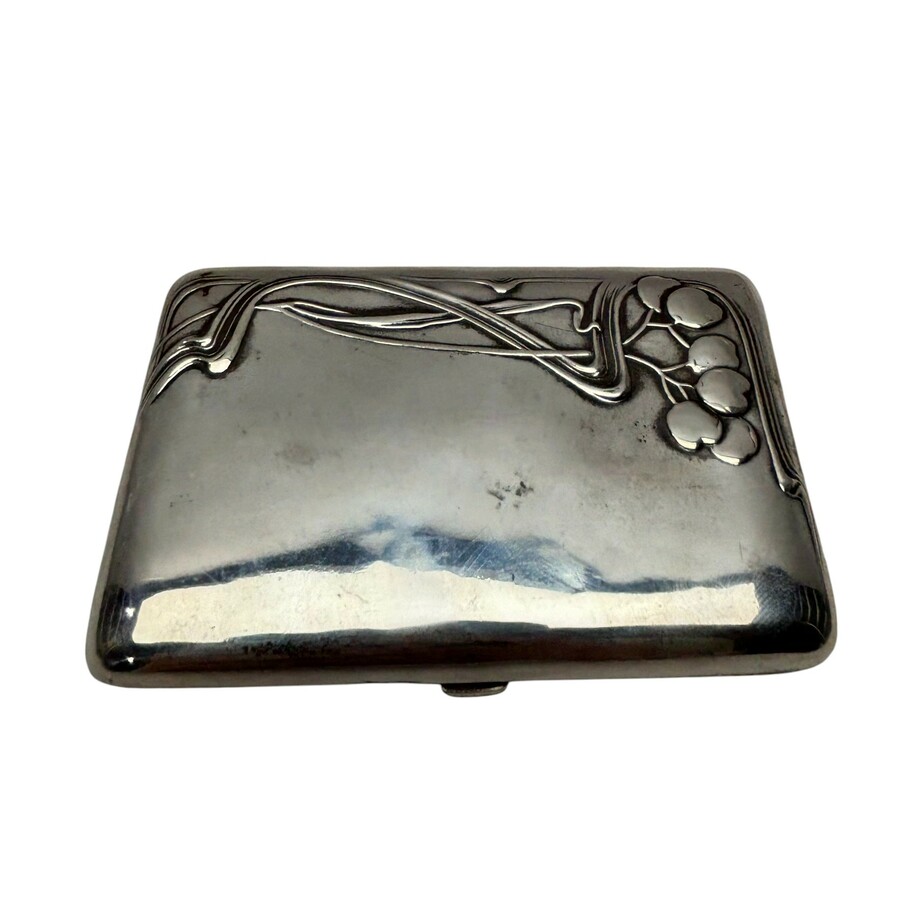 Een antiek derde gehalte (800/1000) zilveren sigarettendoosje, met Jugendstil bloemmotieven. Aan de binnenzijde verguld en gemerkt '800'.