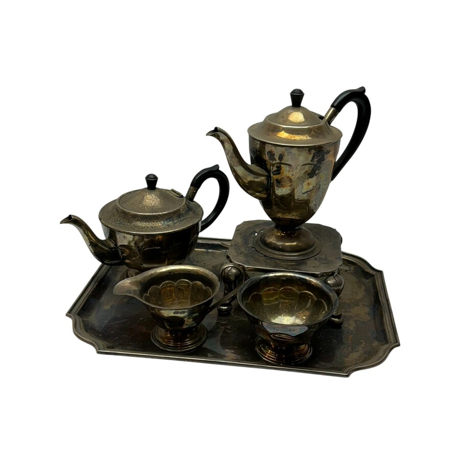 Lot verzilverd: theekan, koffiepot, roomstel, warmhoudertje, en dienblad, vijf delen gedateerd '10-12-'69', enkele gemerkt Sheffield, Engeland, Keltum