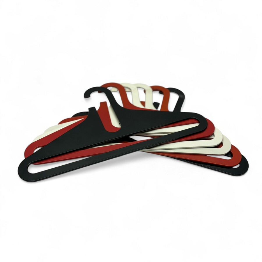 Zes jaren '60 of '70 kunststof kledinghangers in zwart, rood wit en oranje. Ongemerkt, producent Karhumuovi Finland.