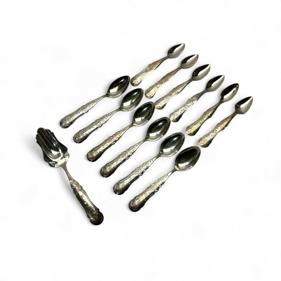 Een set van twaalf zilveren theelepels, 19e en 20e eeuws, gegraveerd, met daarbij een suikerschepje