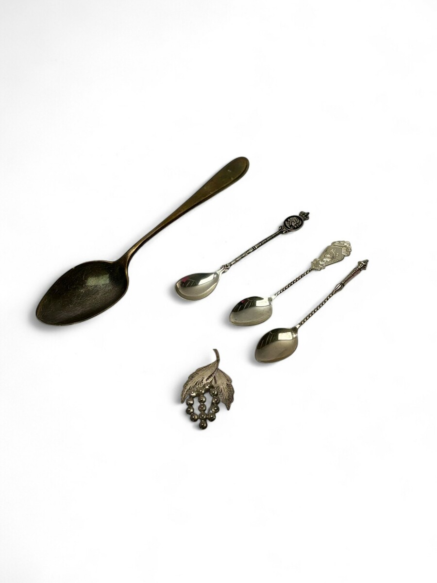 Lot zilver: een filigrain broche, tweede gehalte zilveren lepel met inscriptie, van Kempen en drie theelepels