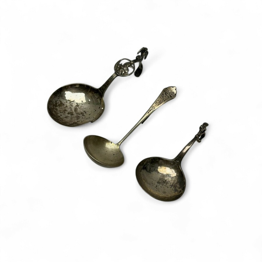 Drie tweede (835/1000) gehalte zilveren roomlepels, waaronder een 18e eeuws exemplaar