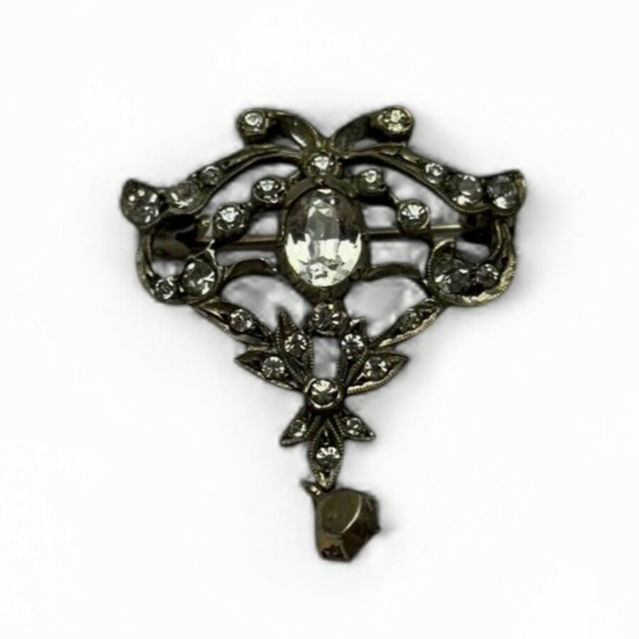 Een antieke derde gehalte (800/1000) zilveren vlindervormige broche met losse pegel, bezet met diverse glassteentjes
