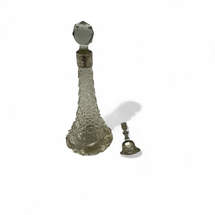 Lot: een tweede gehalte (835/1000) zilveren suikerschepje met op de bak voorstelling van Coopersburg, Akkrum. Met daarbij een karafje, ca. 1900, met eerste gehalte (925/1000) Engels zilveren mon...