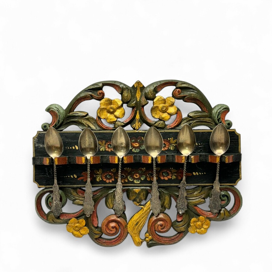 Een antiek gepolychromeerd en gestoken eikenhoutje lepelrekje, Hindelooper decor, met daaraan zes tweede gehalte (835/1000) zilveren theelepels, model Hanekam, gemerkt met meesterteken 'N2' en j...