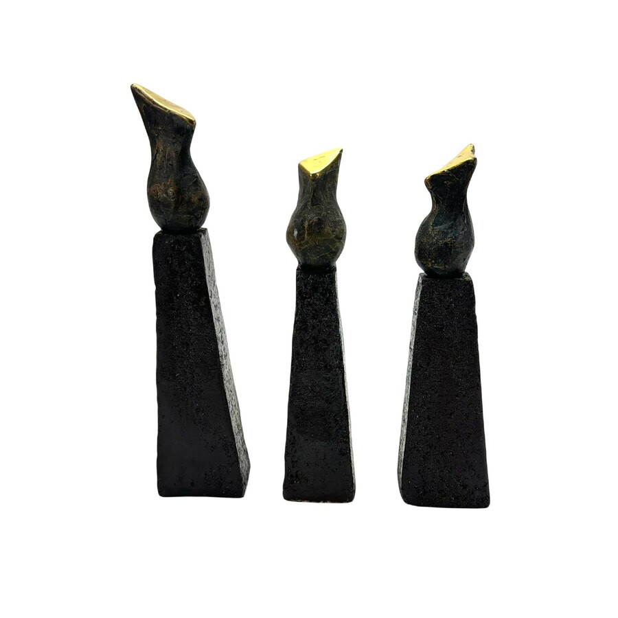 Lot van drie moderne bronzen sculpturen, abstracte figuren op keramieken sokkels. Aan de onderzijde gesigneerd 'Jissy' = Jissy Keuenhof (Kampen, 1970), gedateerd 2001.