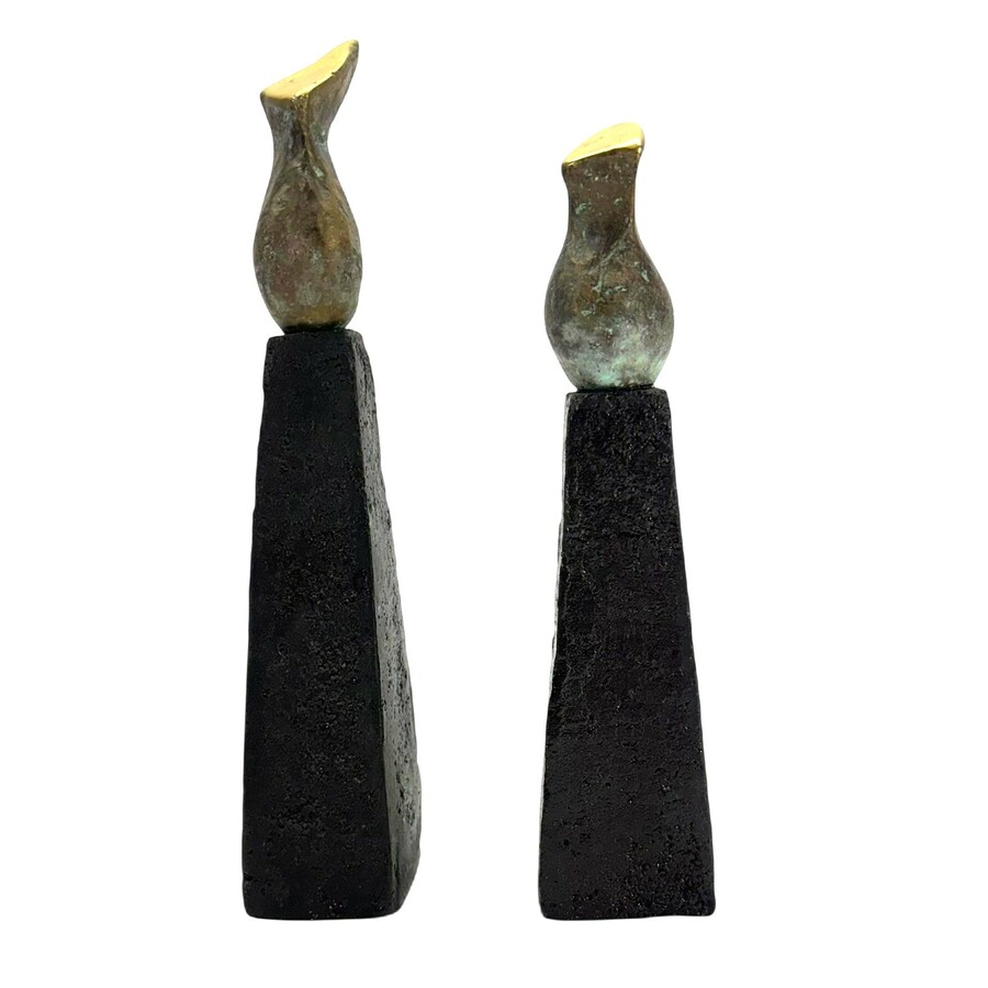 Lot van twee moderne bronzen sculpturen, abstracte figuren op keramieken sokkels. Aan de onderzijde gesigneerd 'Jissy' = Jissy Keuenhof (Kampen, 1970), gedateerd 2001.