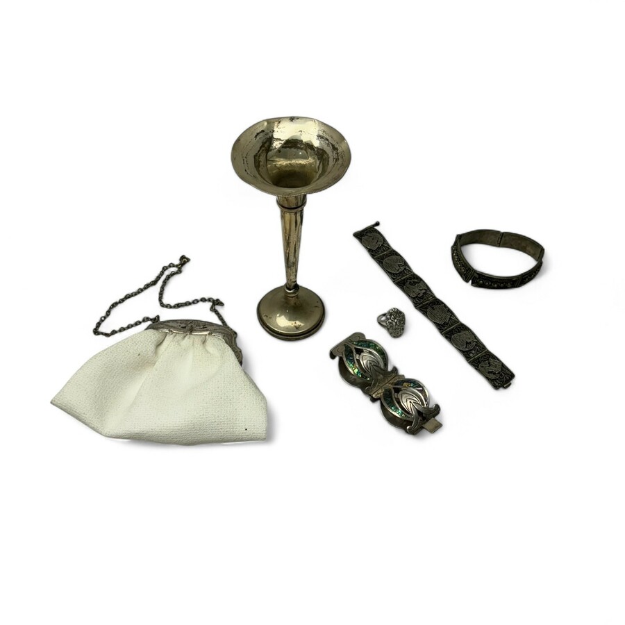 Lot divers zilver: een tweede gehalte (835/1000) zilveren vaasje, zilveren beursbeugeltje, eerste gehalte (925/1000) Mexicaans zilveren armband ingelegd met parelmoer, eerste gehalte (925/1000) ...