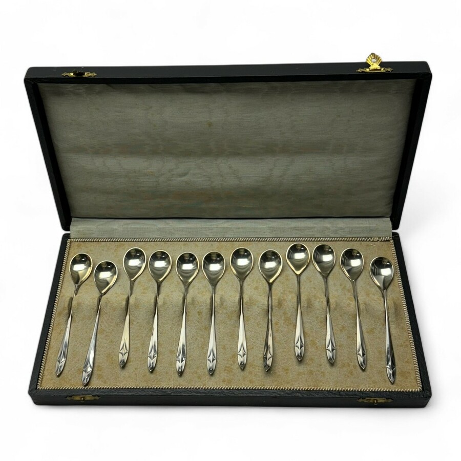 Cassette gevuld met twaalf tweede gehalte (835/1000) zilveren theelepels, gemerkt met zwaardje en 'V' = Voorschoten, ca. 1930.
