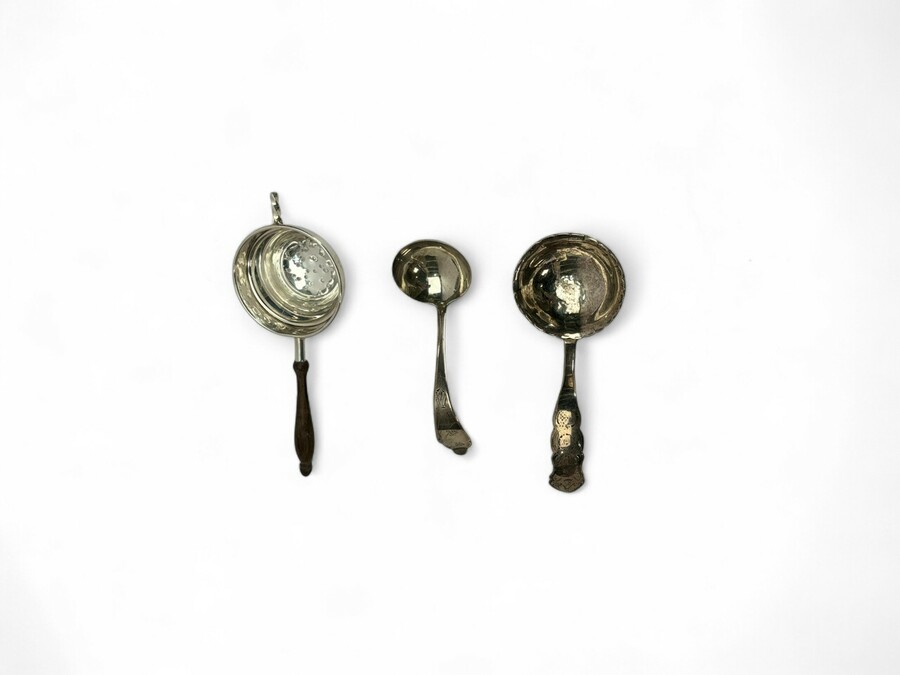 Lot van twee tweede gehalte (835/1000) zilveren roomlepels, met daarbij een zilveren theezeef