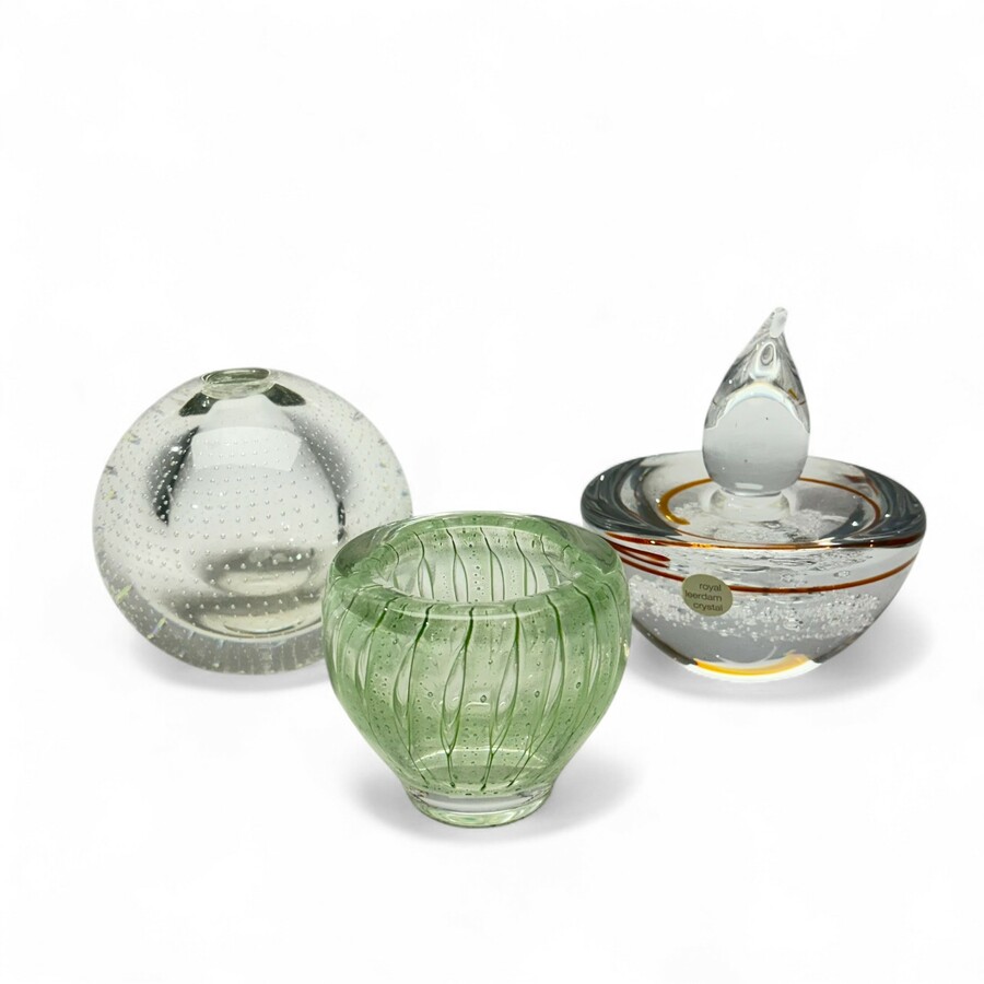 Lot leerdam glazen vaasjes en een kandelaar. Bestaanse uit een Floris Meydam vaasje Serica 81, Andries Copier spijkerbol en een Siem van der Marel kandelaar.