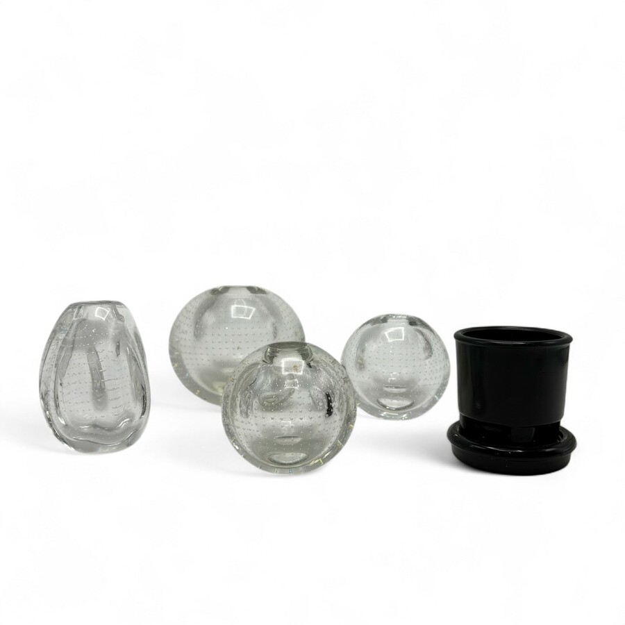 Zwart glazen cactuspotje op bijbehorende onderschotel, gemonogrammeerd, en vier spijkerbol vaasjes,