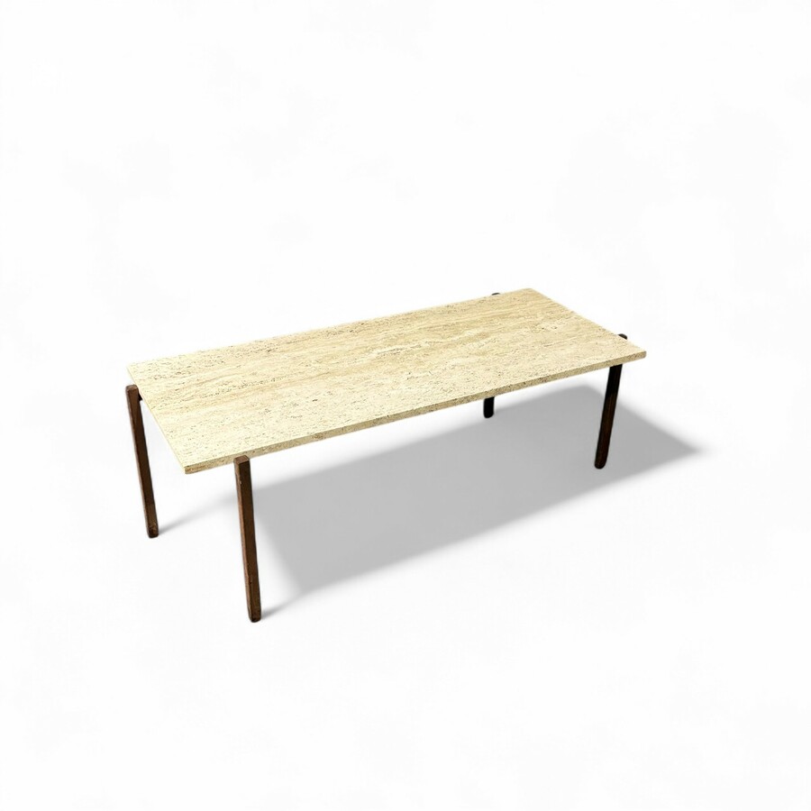 Een jaren '60 design salontafel met metalen onderstel en vierkant travertijnen blad