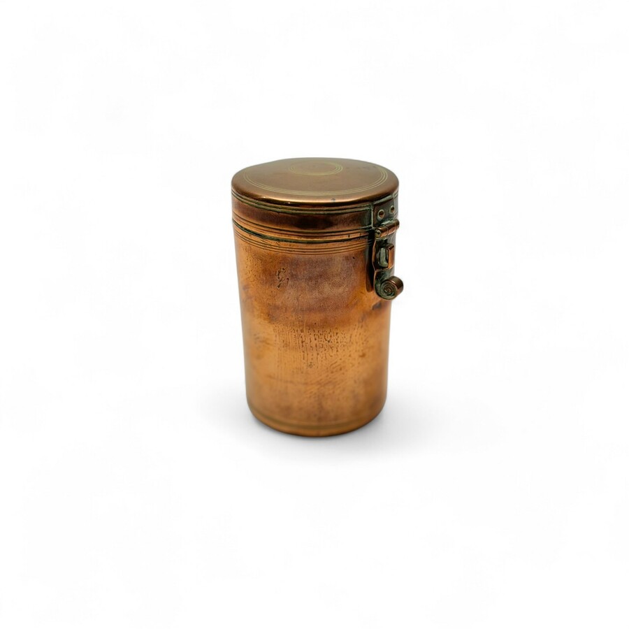 Een vroeg 20e eeuws ronde roodkoperen theebus, ontwerp & uitvoering Jan Eisenloeffel, ca. 1905. Op de bovenzijde gemerkt. Literatuur: Jan Eisenloeffel 1876-1957, p. 157.