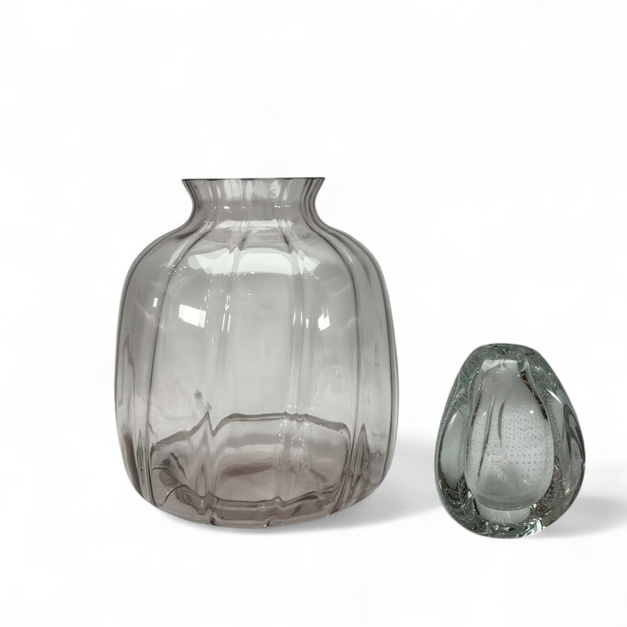 Lot van twee vazen: een paarsglazen vaas, in de stijl van A.D. Copier, en een spijkervaasje, zgn. beukennootje, ontwerp Floris Meydam voor glasfabriek Leerdam