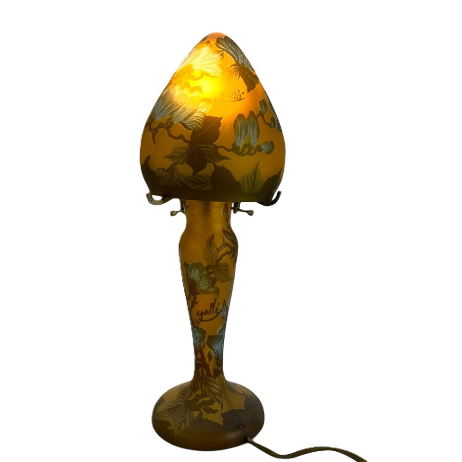 Een 20e eeuws lampje met glazen voet en glazen kap, met naturalistisch decor. In Gallé stijl.