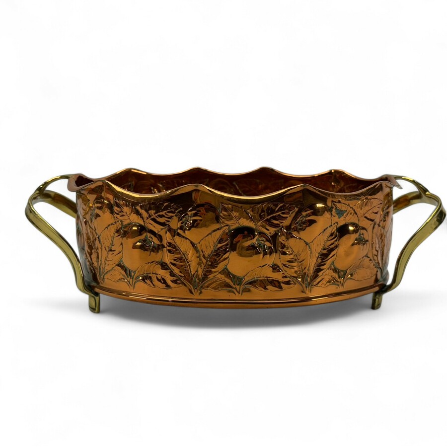 Een koperen ART NOUVEAU jardinaire / fruisschaal met messing oren, . Rondom gedreven motieven van appels en bladeren. Ca 1910.