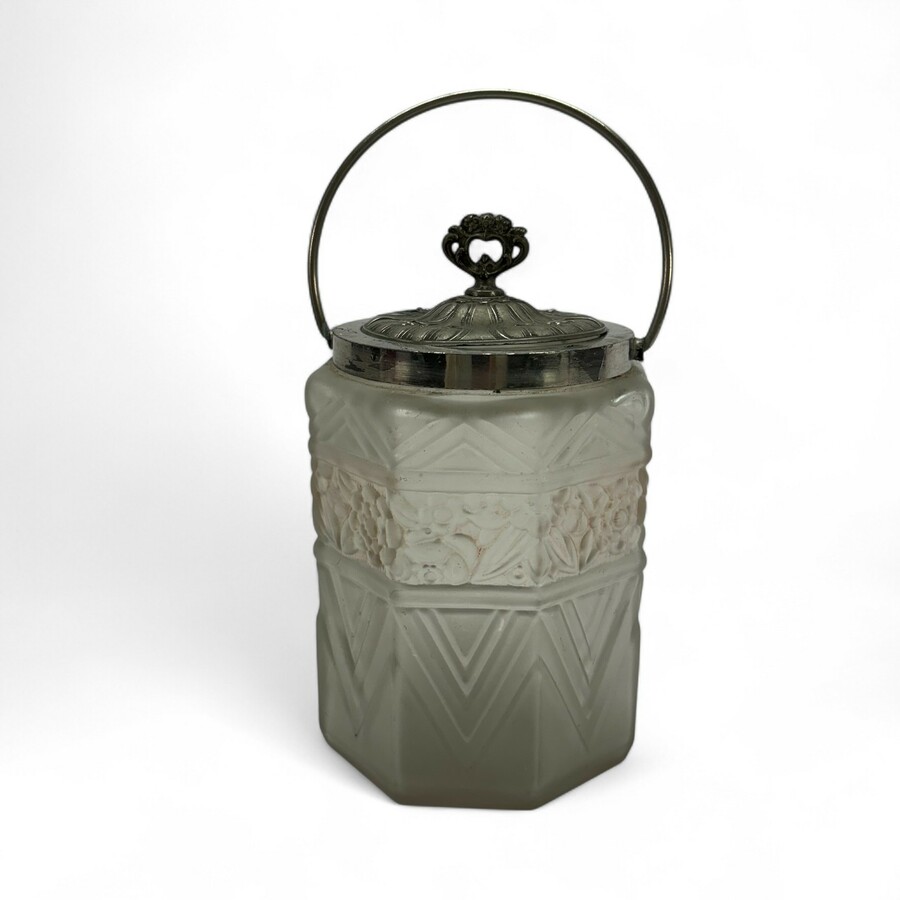 Een ART DECO achtkantige persglazen koekjespot met nikkelen deskel en greep, 23 cm hoog. Met florale decors. Gemerkt Etaleune, Paris France. Ca 1930.