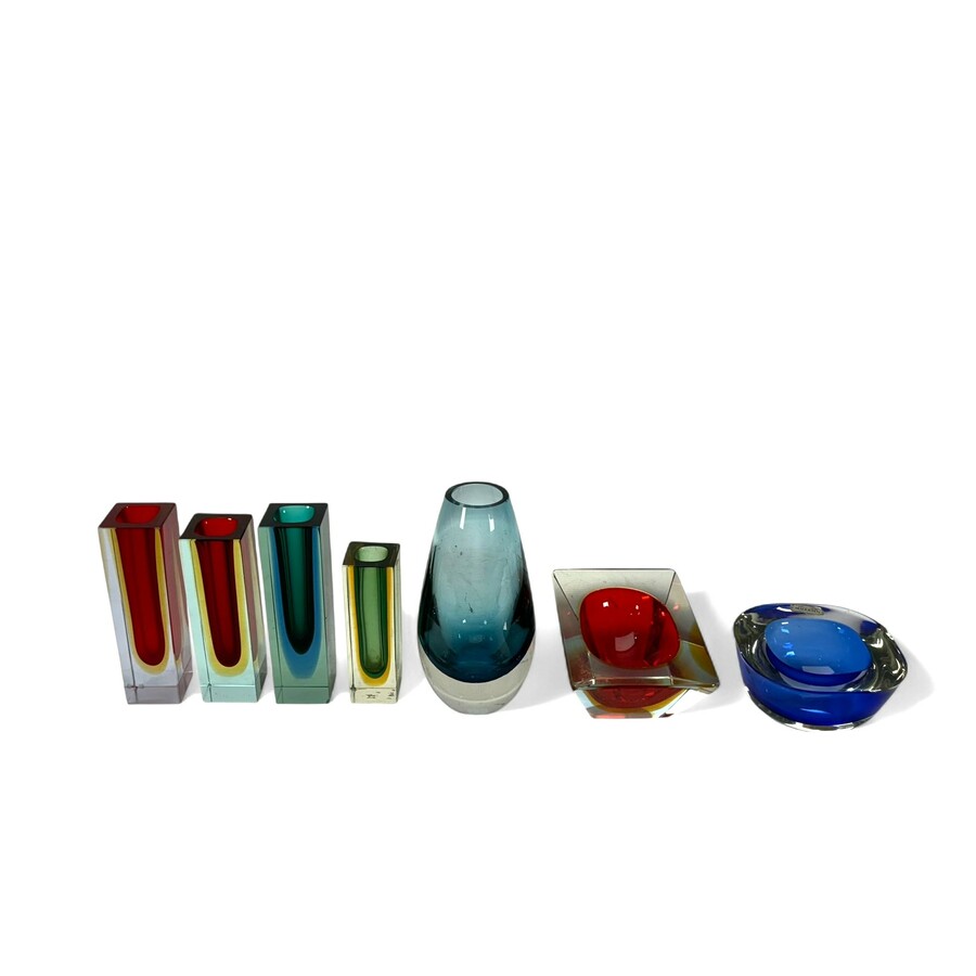 Lot van zeven Sommerso Murano glaswerk , 14 en 18 cm hoog. Vier vierkante , één rond model en twee schaaltjes met blauwe en rode kernen. Ontwerp Flavio Poli ca 1965.