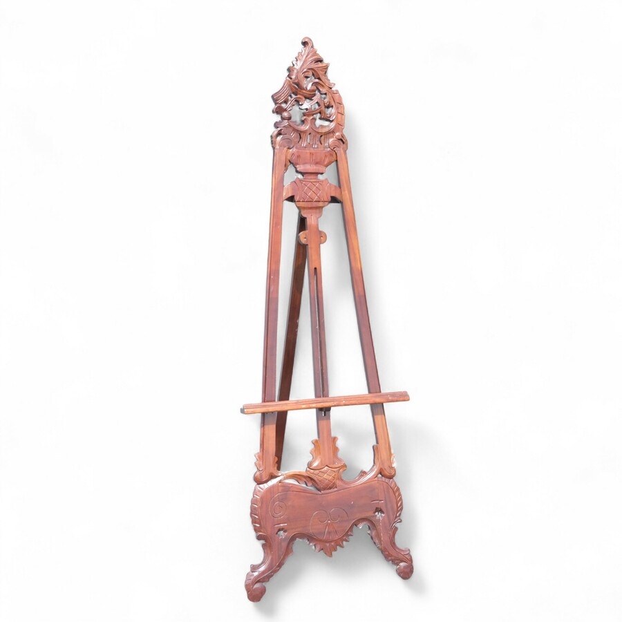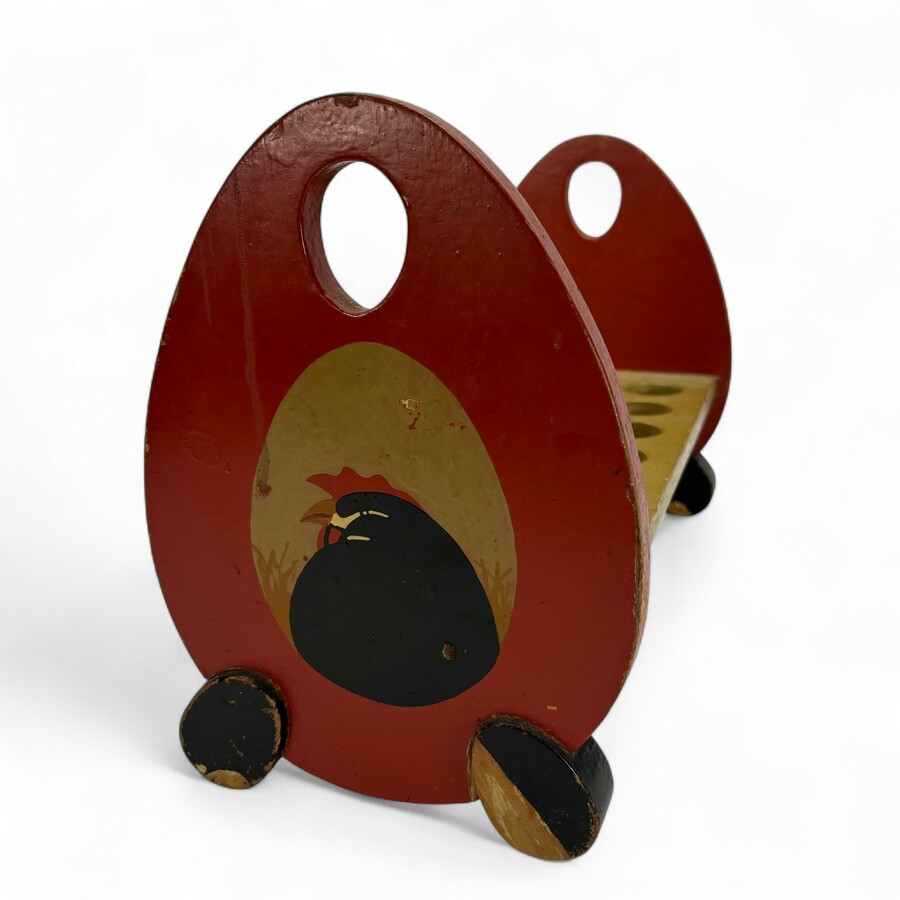Een houten Amsterdamse school eierenhouder/rek, . Oranje zwart met aan weerskanten een beschildering van een kip. Op zwarte eivormige voetjes. Ca 1930.