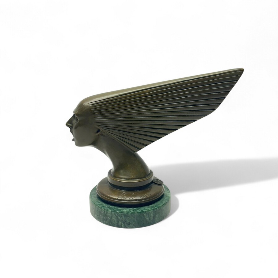 Een 20e eeuws art deco stijl bronzen sculptuur, automascotte, op marmeren sokkel, zgn. ‘Spirit op the wind’.