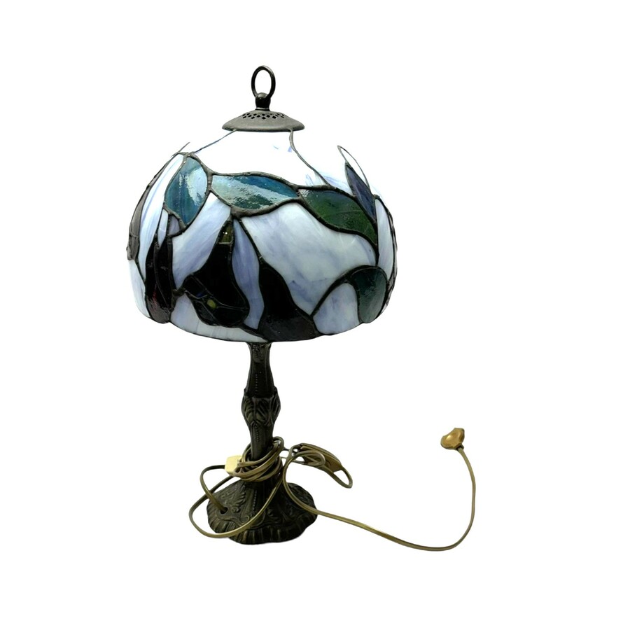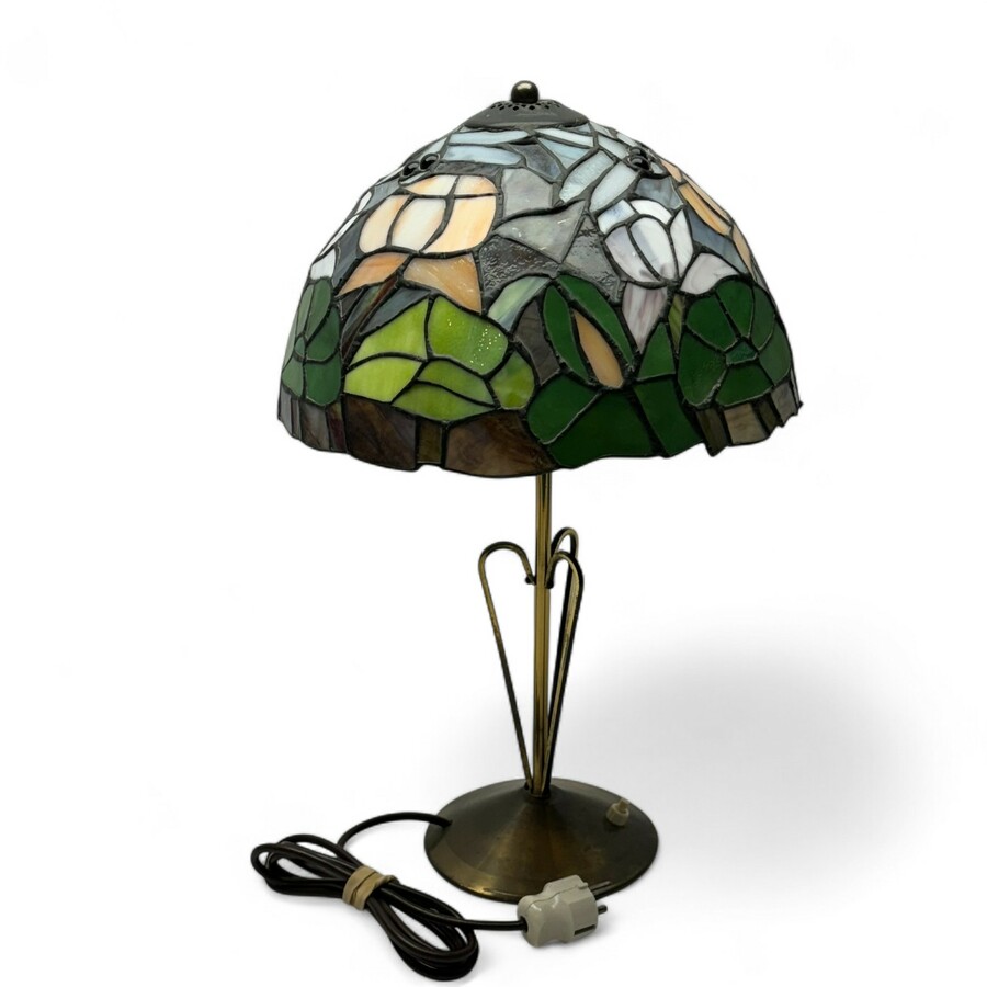 Een Tiffany stijl tafellamp op een gebruineerd metalen stamvormige lampenvoet. Met een paars / groen glas in lood kap.