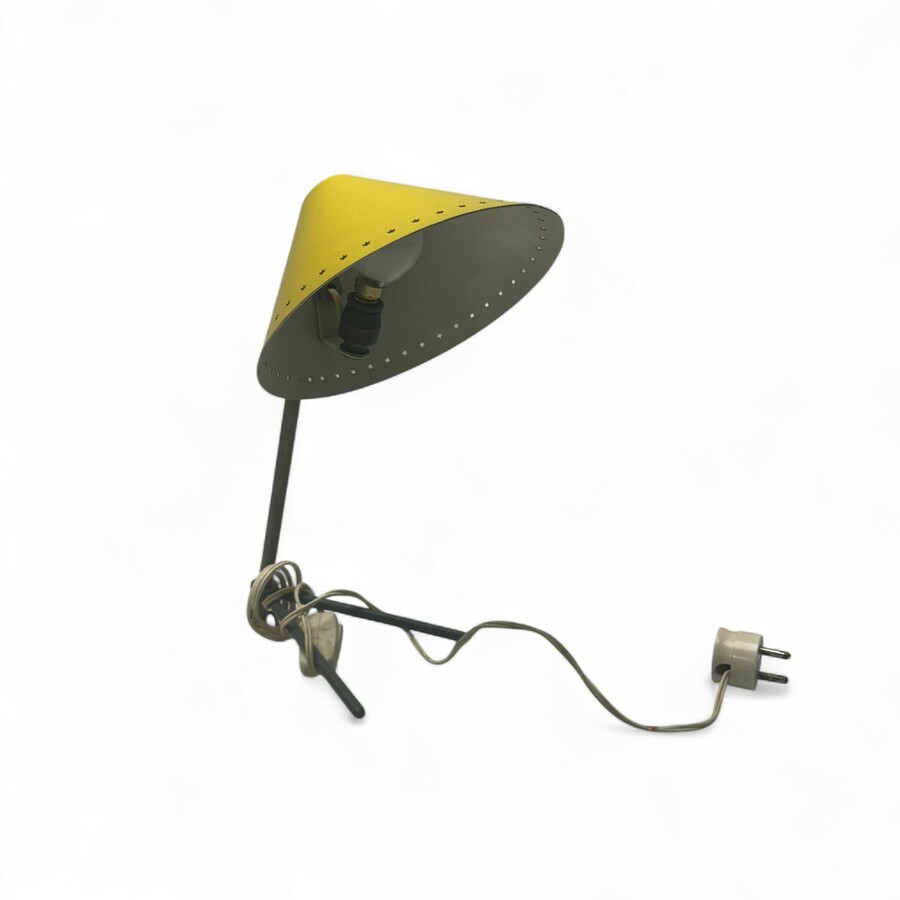 Pinocchio (Pinokkio) metalen tafellamp met gele kap. Ontwerp van H. Busquet voor HALA, Zeist. Jaren 50.