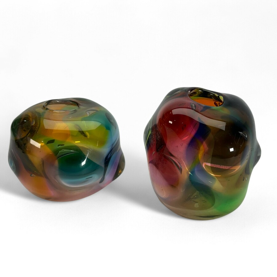 Twee moderne meerkleurig glazen unica vazen, ontwerp Yvon Trossèl (Sassenheim, 1962), gedateerd 2001 en 2002.