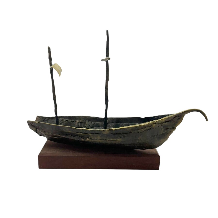 Een modern bronzen sculptuur, unica, zeilschip met twee masten, op houten sokkel. Aan de onderzijde van de sokkel gesigneerd gesigneerd 'Jissy' = Jissy Keuenhof (Kampen, 1970), gedateerd 2001.