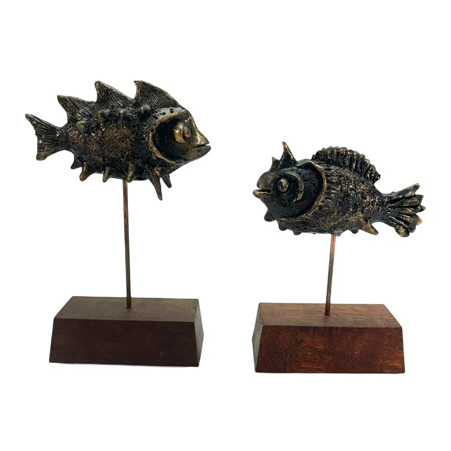 Lot van twee moderne bronzen sculpturen, vissen, op houten sokkels. Beide aan de onderzijde gesigneerd 'Jissy' = Jissy Keuenhof (Kampen, 1970), gedateerd 2003.