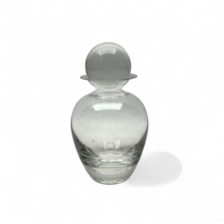 Een 20e eeuwse helderglazen likeurkaraf, met ronde bol als stop. Ontwerp A.D. Copier voor glasfabriek Leerdam, model Rondo. Aan de onderzijde gemerkt met etsmerk.