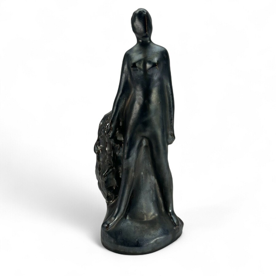 Een keramieken met sculptuur met bronskleurige glazuur, 35 cm hoog. Staand naakte dame in de stijl van Hildo Krop. Niet gesigneerd. 20e eeuws
