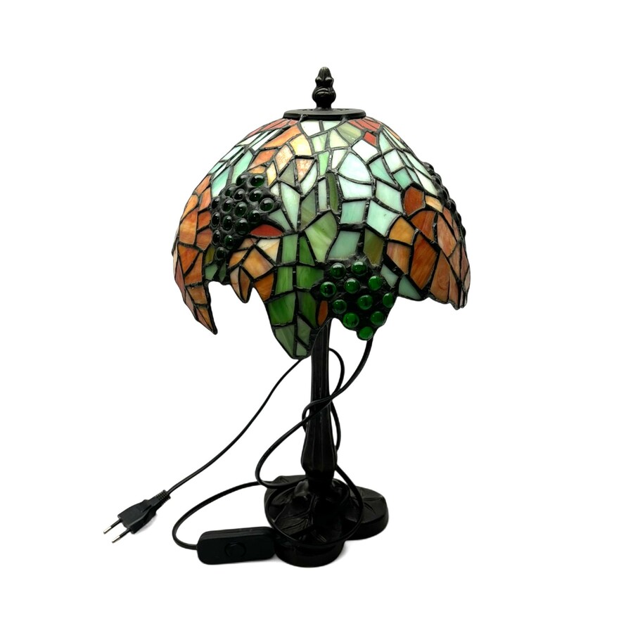 Een Tiffany stijl tafellamp op een gebruineerd metalen stam en bladvormige lampenvoet. Met een oranje / groen met druiventrossen glas in lood kap.
