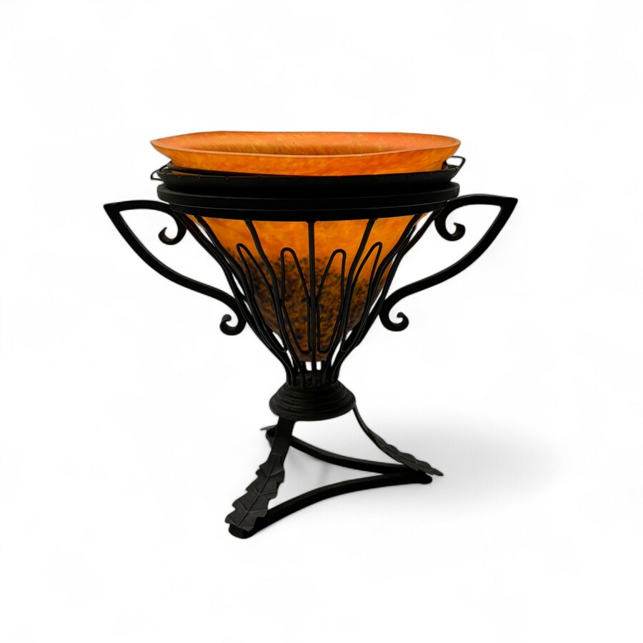 Een Frans oranje persglazen sierschaal in een smeedijzeren montuur met twee oren. Naar een Frans art deco model van Schneider,.