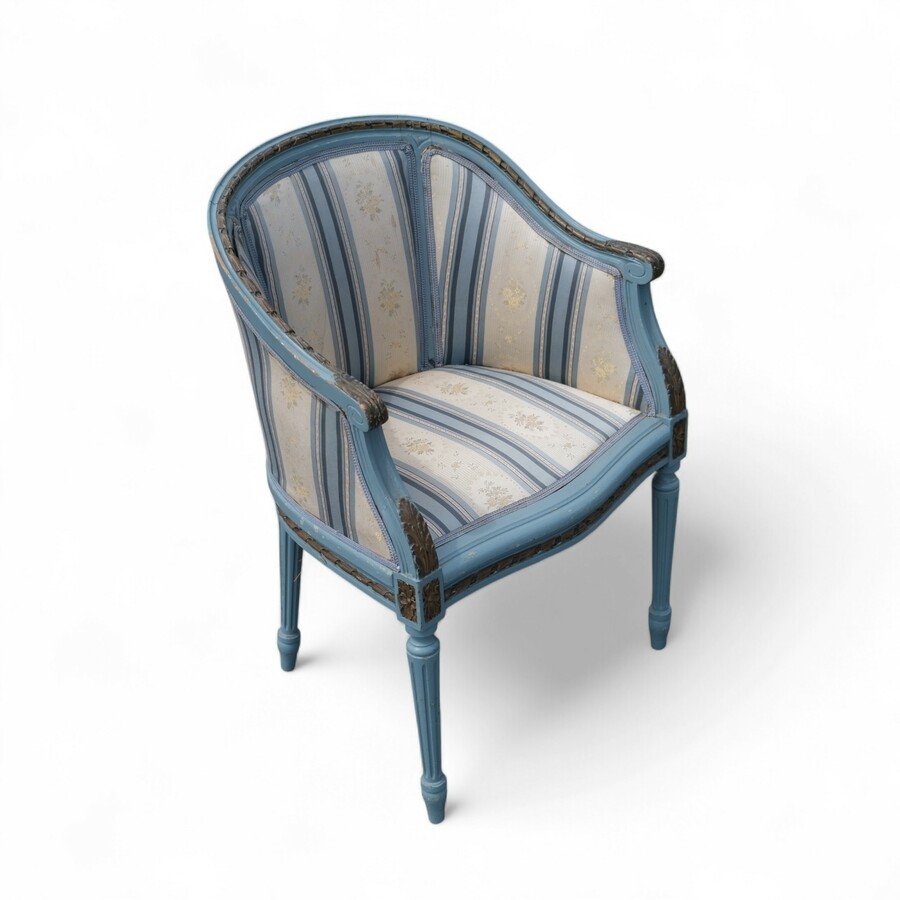 Een 20e eeuwse blauwbeschilderde fauteuil in Louis Seize stijl, met blauw-witte bekleding