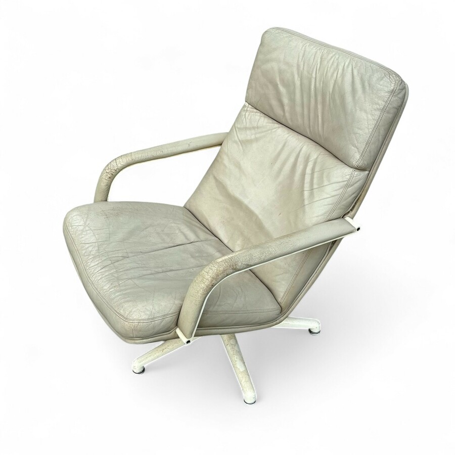 Een 20e eeuwse fauteuil met grijs lederen bekleding, ontwerp Geoffrey Harcourt voor Artifort, model F141.