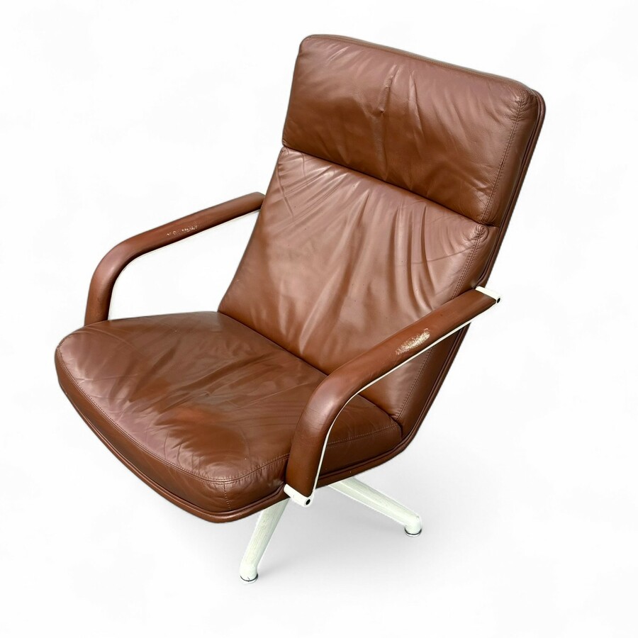 Een 20e eeuwse fauteuil met bruin lederen bekleding, ontwerp Geoffrey Harcourt voor Artifort, model F141.