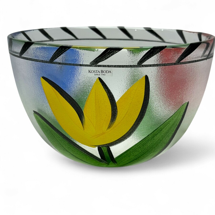 Een 20e eeuwse glazen design schaal met beschilderd decor van rode, gele en blauwe tulp. Ontwerp Ulrica Hydman-Vallien (1938-2018) voor Kosta Boda, Zweden. Aan de onderzijde gemerkt ‘Maersk’