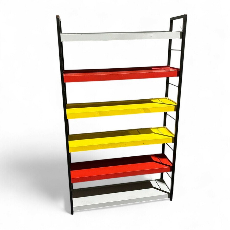 Metalen boekenrek, ontwerp D.Dekker voor Tomado, Nederland, 1958. Zwart metalen frame met zes leggers.
