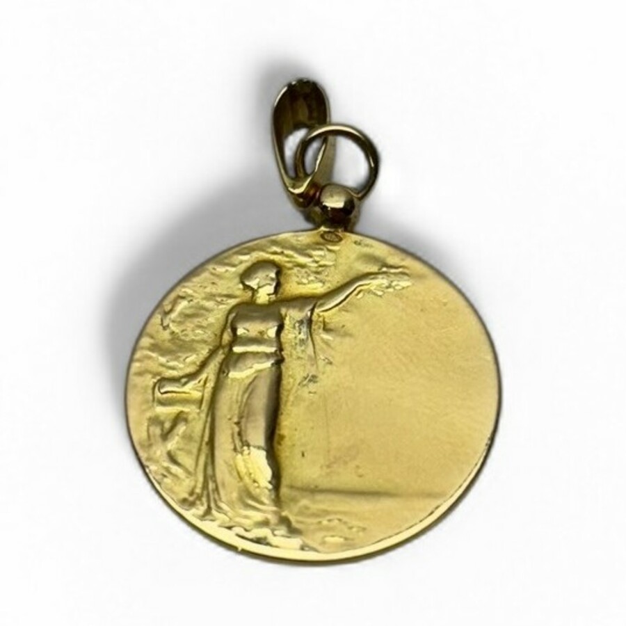 Een 20e eeuwse 14 karaats (585/1000) geelgouden zeilmedaille, in Jugendstil stijl. Aan de achterzijde gegraveerd ‘Wartena Kamp Pr. Larken 1939’