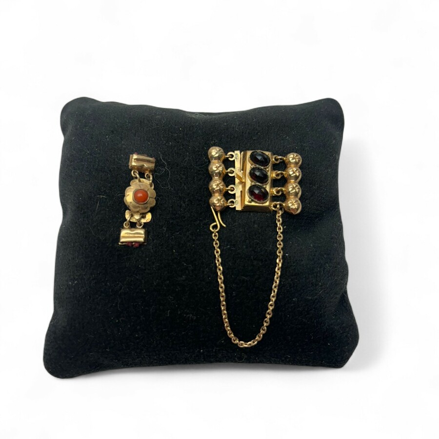 Lot van twee antieke 14 karaats (585/1000) geelgouden sluitingen, één voor een tweerijig bloedkoralen armbandje of collier en één voor een vierrijig granaten armbandje. Samen 3,09 gram