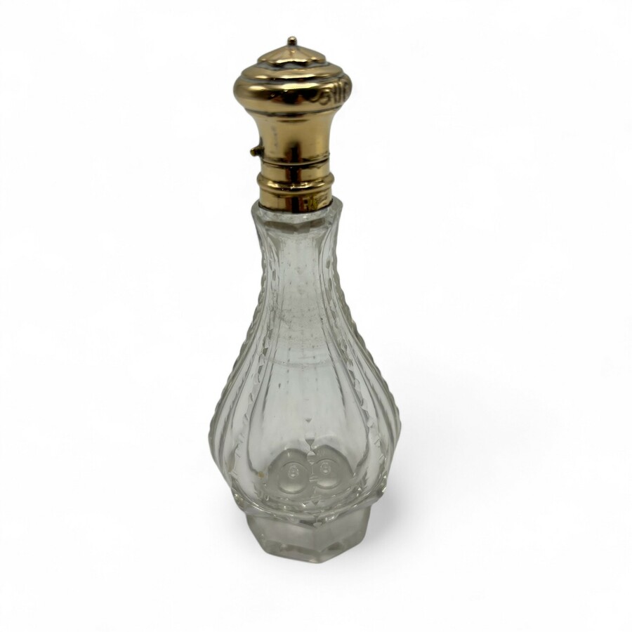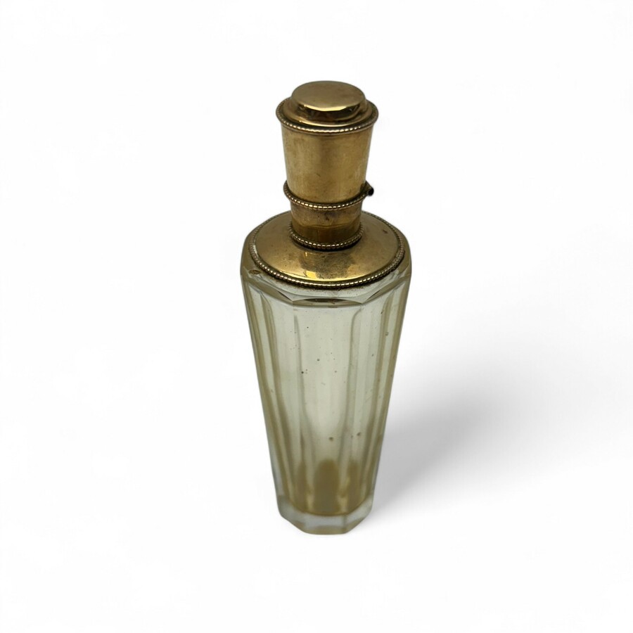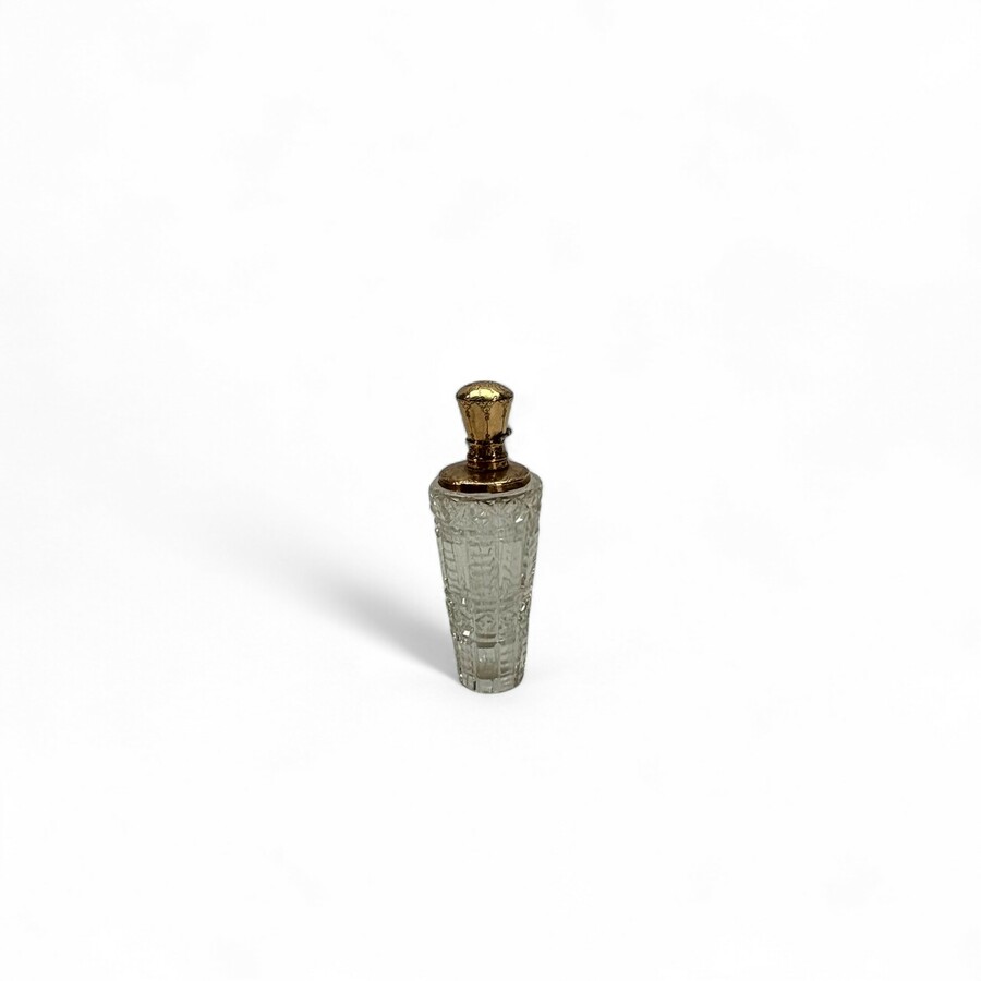 Een antieke 19e eeuwse kristallen parfumflacon met 14 karaats (585/1000) geelgouden hals en dop. Zonder binnenstopje