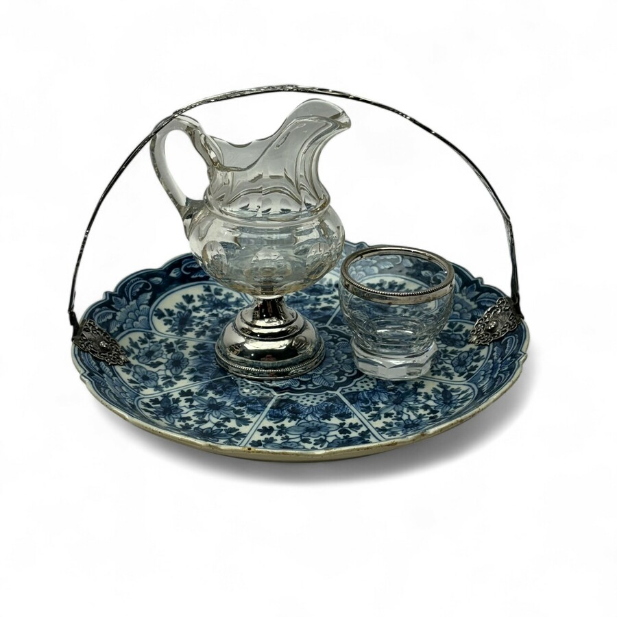 Lot: een 20e eeuwse blauw-wit aardewerken schaal, gemerkt Tichelaar Makkum, met tweede gehalte (835/1000) zilveren beugel. Met daarbij een kristallen houder voor theezeefje met zilveren rand en ...