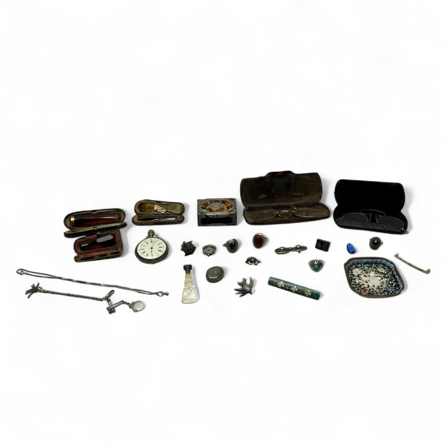 Lot met divers zilver en verzilverd. Bestaand uit twee brillen in etui's, zakhorloge, diverse hangers en broches en een lakstempel aan parelmoeren heft en sigarenpijpjes in foedraal.