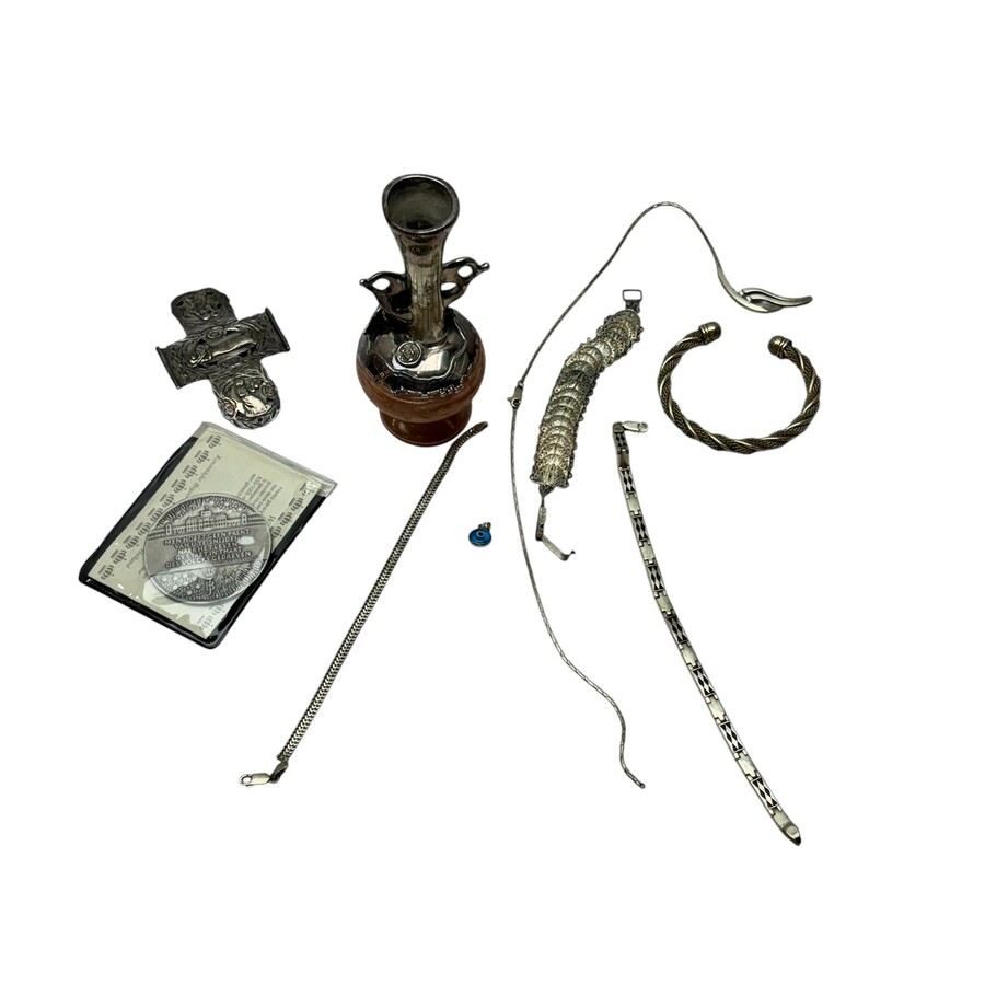 Lot divers zilver, waaronder een vaasje met eerste gehalte (925/1000) glazen vaasje, een broche gemaakt van Bijbelslot, een filigrain Indonesisch armbandje, een tweede gehalte (835/1000) zilvere...