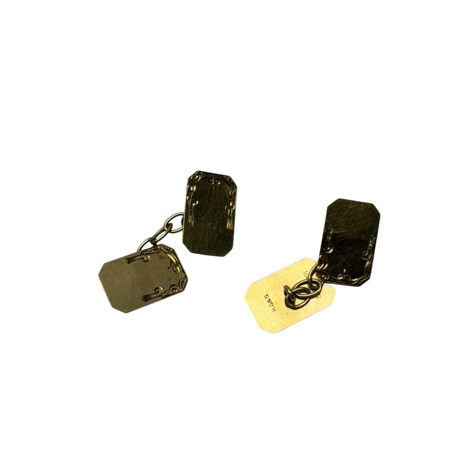 Een stel 20e eeuwse Engelse 9 karaats (375/1000) geelgouden manchetknopen met gegraveerd decor. Gemerkt '375', ankertje, jaarletter F en 'HG&S' = Henry Griffith & Sons, Birmingham.