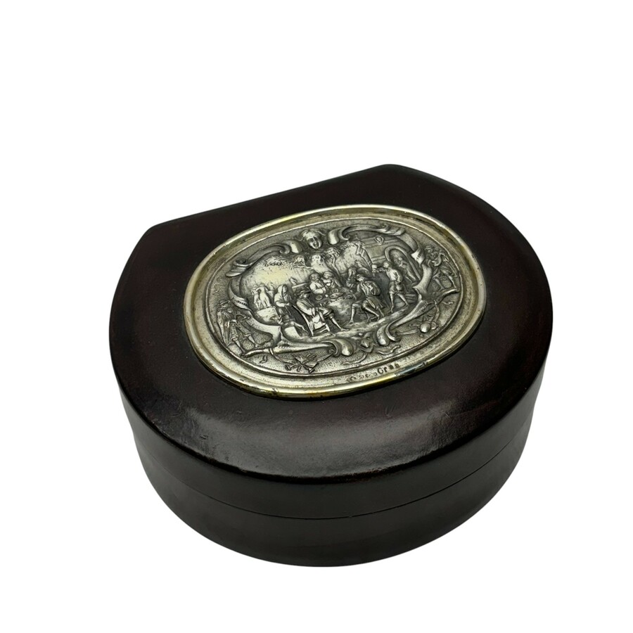 Een 20e eeuws lederen sieradendoosje met ovaal eerste gehalte (925/1000) zilveren applique. Gevuld met diversen, o.a. een (900/1000) zilveren lakstempel, guilloche emaille, en tweede gehalte (83...
