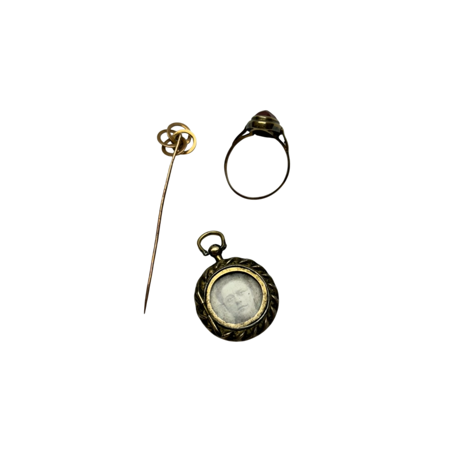 Lot divers goud: een medaillon, speld en ring met gefacetteerde carneool.