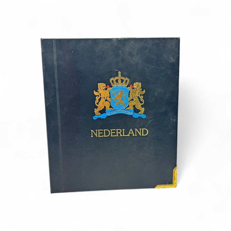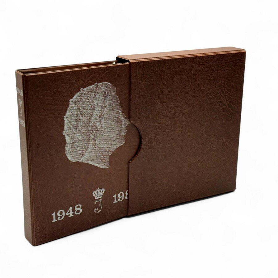 Een 20e eeuws bruin muntenalbum, verzameling Nederland vanaf 1950: 1 cent periode 1950-1980, 5 cent 1950-1980, 10 cent 1950-1980, 25 cent 1950-1980, 1 Gulden periode 1950-1980, Rijksdaalder peri...